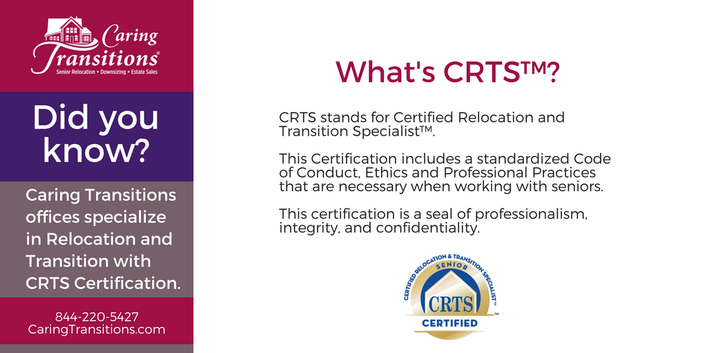 Each Caring Transitions office specializes in Relocation and Transition through their CRTS Certification. CRTS was founded in 2004 to standardize the knowledge within industries that cater to senior relocation, downsizing, and aging in place. The certification itself stands for Certified Relocation and Transition Specialist™.